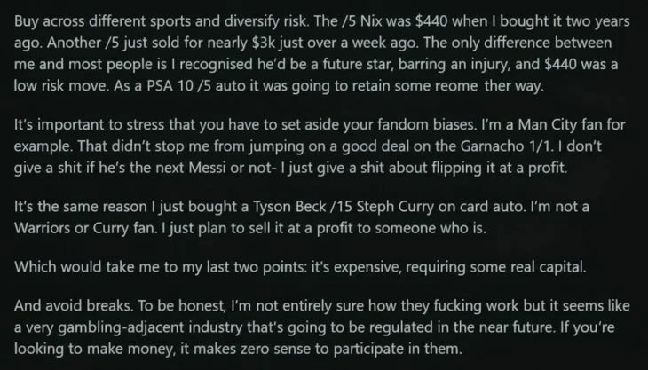 Тем не менее заработать на карточках реально даже с относительно небольшими вложениями. Выгодно покупать карты перспективных новичков NBA, NFL, MLB. Если игрок со временем станет звездой, стоимость карточки может вырасти в десятки раз.