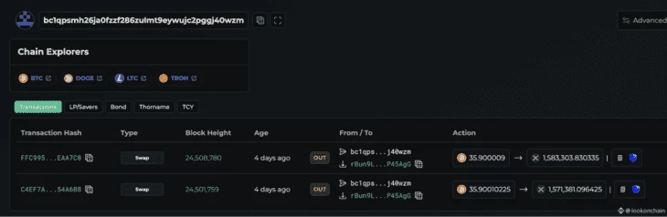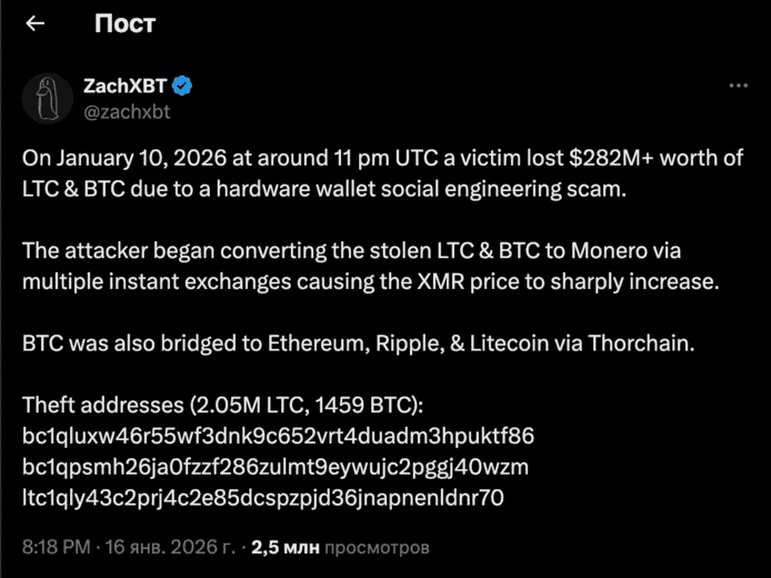 Изначально эту кражу обнаружил популярный блокчейн-детектив Zachxbt. Он заявил, что жертва мошенничества потеряла более $282 миллионов в криптовалюте LTC и BTC. Злоумышленник обменял часть LTC и BTC на XMR, это вызвало резкий скачок цены XMR. Мошенник также использовал THORChain для обмена 818 BTC ($78 млн) на 19 631 ETH ($64,5 млн), 3,15 млн XRP ($6,5 млн) и 77 285 LTC ($5,8 млн).