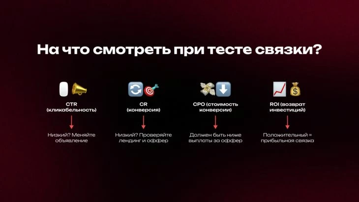 - Нет апрува и конверсии на тесте — значит, ты не попал в аудиторию или трафик вообще не тот.