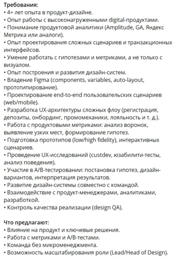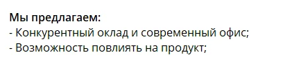 Разное написание слов — аналогично тому, что написано выше. Если в начале текста написано «удалёнка», а потом «удаленка» — это повод если не игнорить вакансию, то хотя бы задуматься, а почему так. Спойлер: а потому что тот, кто эту вакансию составлял, плевать хотел на то, как оно выглядит целиком. А почему? Обычно потому, что зарплата не мотивирует уделить пару минут и привести стиль текста к единообразию. Вот и думайте, хотите ли вы «туда».