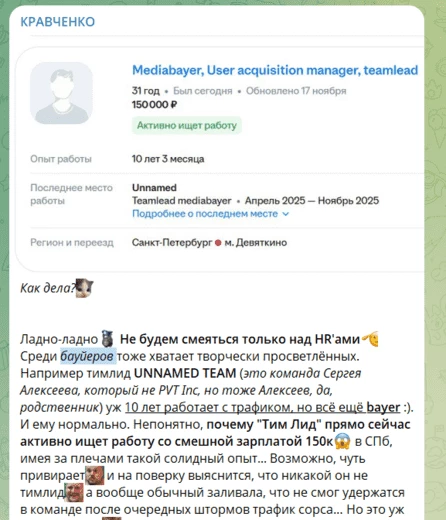 А с вакансиями, опять отдельно повторим — не всегда, но чаще всего, лютый треш. И мы сейчас даже не про «бауеров», «фермеров», и прочих «биздевов на позиции сейлза» — ибо это как раз таки скорее фишка сферы, нежели показатель работы HR. Хотя… среди конкретно этих трех причин баттхерта господина Кравченко (конкретно кейс про «фермеры») — это все же не «милая оплошность» или «фишка сферы», а то, что действительно может отпугнуть специалистов. Потому что одно дело, когда байер идет работать «бауером», и совсем другое, когда фармер — фермером. К аграрному труду арбитражники, в массе своей, все же теплых чувств не испытывают.