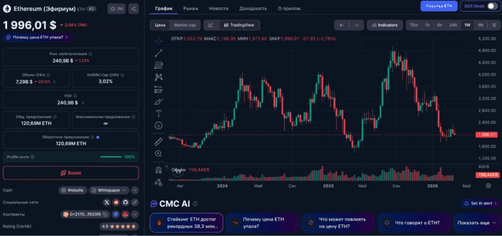 После исторического максимума в августе 2025 года Ethereum заметно сдал позиции, откатившись, по данным CoinMarketCap, к уровню $1996 и оказавшись под давлением слабого рынка, геополитики и оттоков капитала.