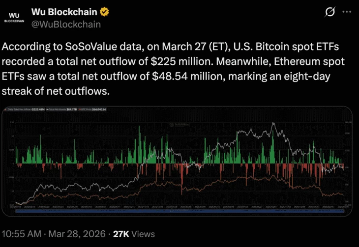 27 марта из американских ETF, ориентированных на биткоин, зафиксирован чистый отток средств в размере $225 млн. Похожая ситуация наблюдается и с Ethereum: из спотовых ETF на эфир вывели $48,54 млн, и это уже восьмой день подряд, когда фиксируется отток средств.