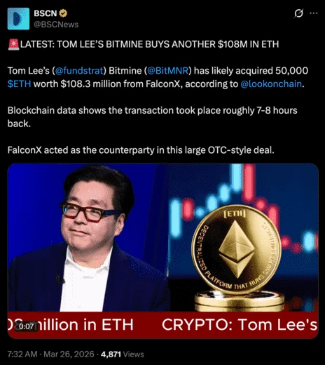 Новость в сети Х о том, что Bitmine приобрела ETH на $108 млн