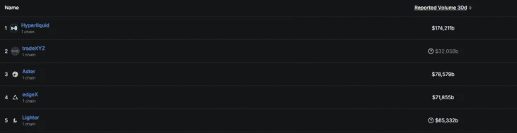 Если смотреть на статистику DefilLama за последние 30 дней, то Hyperliquid по объемам обгоняет Lighter примерно в 2,66 раз.
