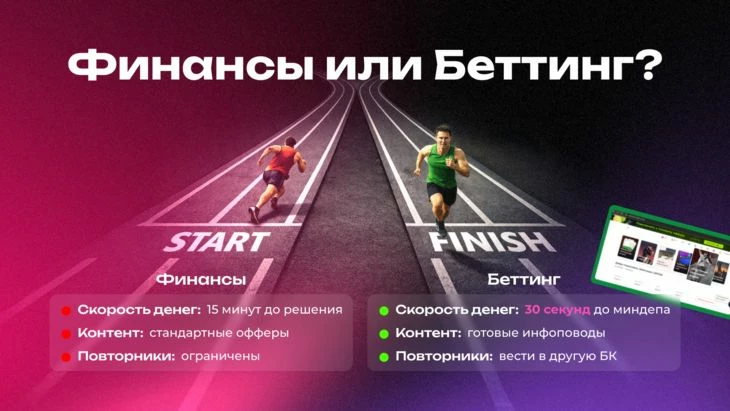 Скорость денег. В МФО от клика до апрува проходит минут 15, и это считается быстро. В товарке — дни, пока заказ доедет. В дейтинге вообще непонятно, когда пользователь начнет платить. В беттинге от клика до миндепа (минимального депозита) — 30 секунд. Ты быстрее видишь результат и быстрее оборачиваешь бюджет.