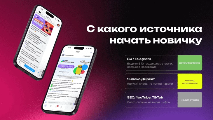 Пуши и тизерные сети можно попробовать, но это скорее, когда ты уже понимаешь, что делаешь. Там дёшево, но качество трафика часто ниже, конверсия может быть очень слабой.