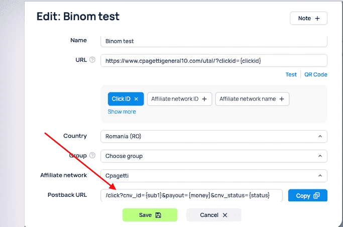 - В Binom сгенерируйте Postback URL для CPAgetti (с учётом нужных макросов статусов).