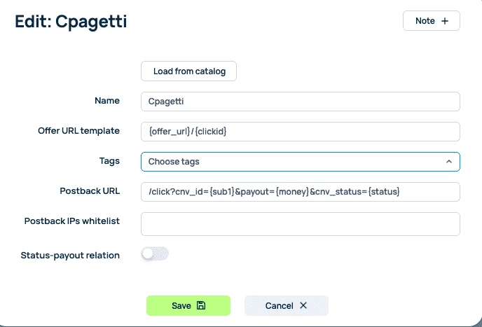 - Вернитесь в кабинет CPAgetti и вставьте этот URL в поле Postback: