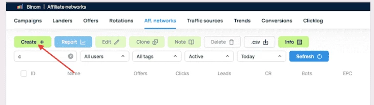 - В Binom откройте раздел Affiliate Networks.