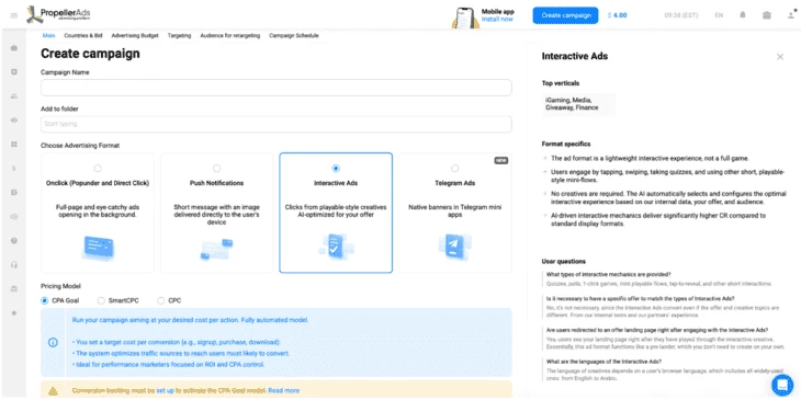 Формат Interactive Ads доступен прямо в форме создания кампании в панели управления PropellerAds.