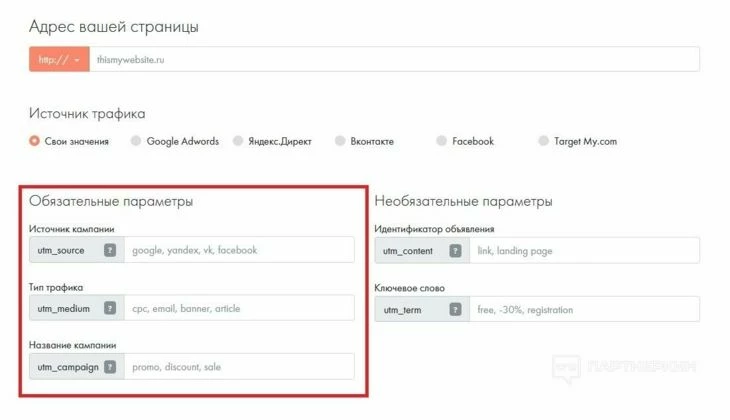 Для данного процесса нам понадобится генератор ЮТМ-меток под Тильда, где нужно написать адрес требуемой страницы, не пропустив 3 обязательных к заполнению строки: