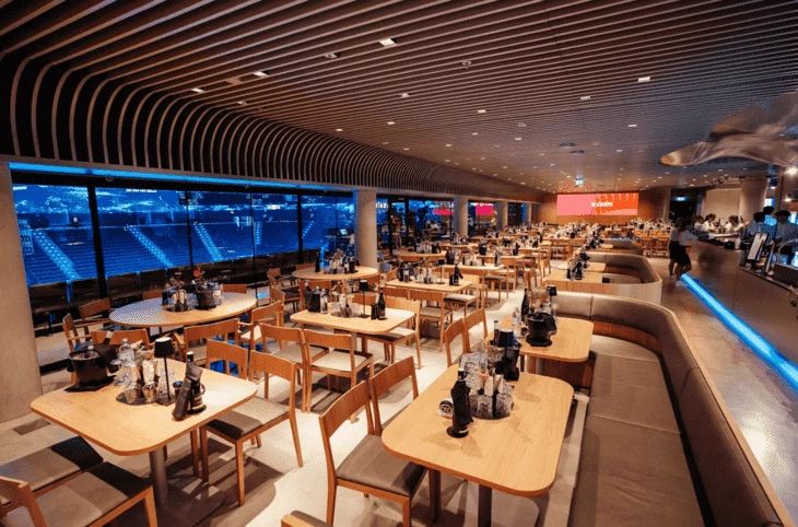 Второй VIP-ужин, тот, о котором здесь речь, также доступен исключительно для держателей билетов категорий Premium и Platinum. И даже здание то же самое — Crowne Plaza Dubai Festival City, однако уже в стенах Belgian Beer Cafe. И пусть слово «cafe» вас не смущает — это роскошный ресторан с террасой и просто феерическим видом на Персидский залив и ночной Дубай.