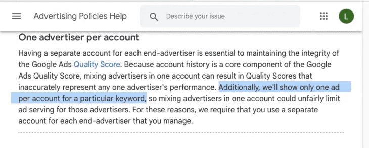 Сначала многие рекламодатели и вебмастеры были озадачены, т.к. Google обновил свою политику в отношении «недобросовестного преимущества». Эта политика запрещает «двойное обслуживание» (double serving) для одной рекламной позиции, то есть показ нескольких объявлений с разных аккаунтов или доменов, ведущих к одному бизнесу, с целью вытеснения конкурентов.