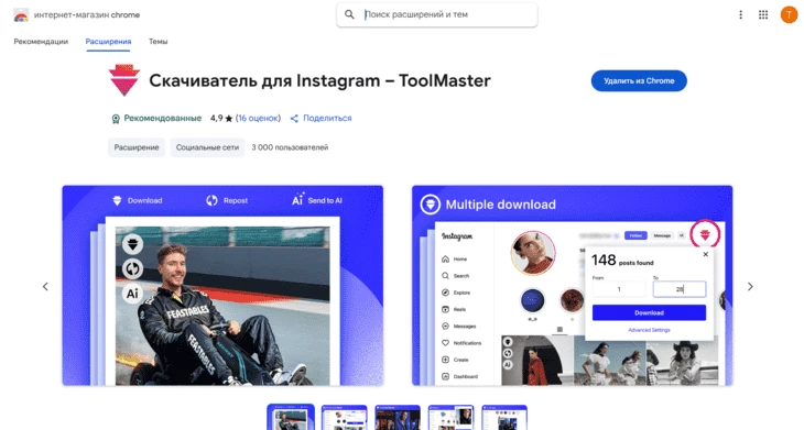 Downloader for Instagram – ToolMaster. Фактически расширение работает не как просмотрщик медиафайлов, а в качестве загрузчика. После установки дополнение встраивается в браузер и показывает кнопку загрузки на странице аккаунта Инстаграм.