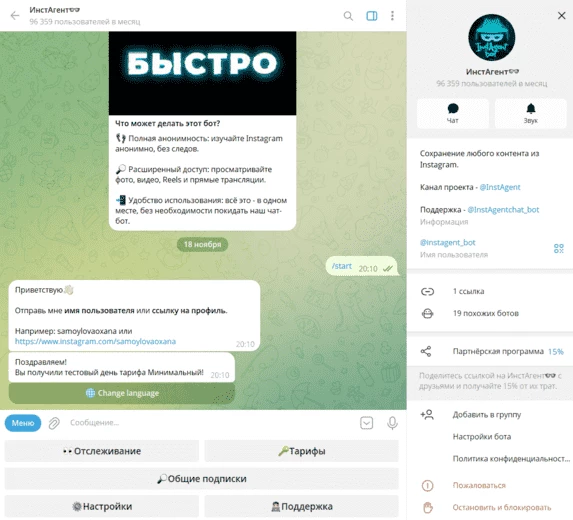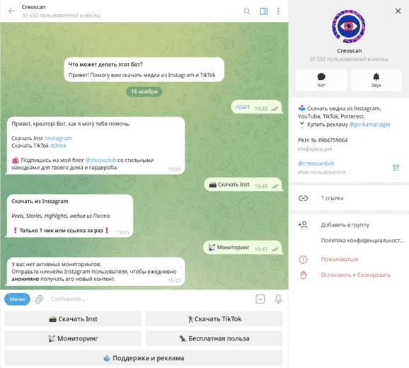 Частота отслеживания. ТГ-боты часто предлагают такую функцию, как постоянный мониторинг определенных аккаунтов. Это удобно, если вы отслеживаете профиль и не хотите каждый раз переходить в соцсеть.