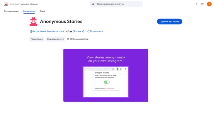 Anonymous Stories. Этот вариант подходит для тех, кто хочет смотреть инстасторис в анониме напрямую из аккаунта, но при этом скрыть факт просмотра. Чтобы использовать приложение, достаточно установить его в браузер на основе Chrome и активировать, передвинув тумблер. После этого пользователь может просмотреть чужую сториз, не покидая соцсеть и не открывая дополнительные вкладки.