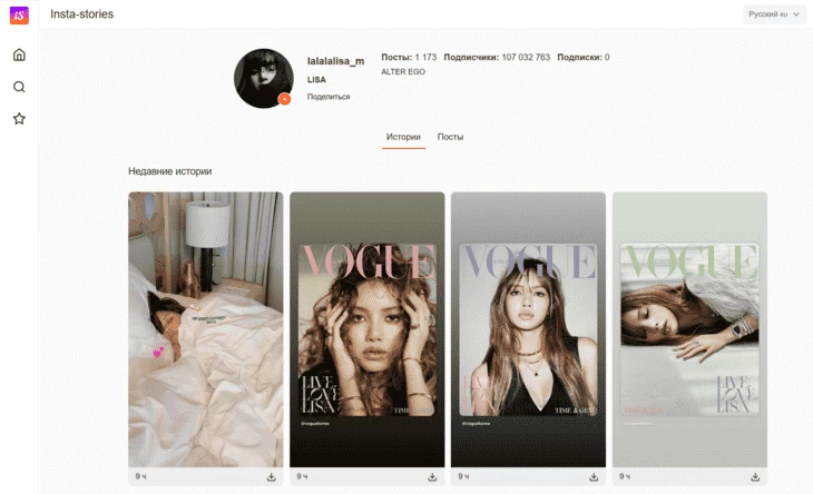 Доступны сториз, фото, хайлайты и рилз. Чтобы открыть пост, достаточно кликнуть на него и посмотреть в полномасштабном режиме. Сервис также отображает статистику публикаций: количество просмотров, комментарии и время публикации.