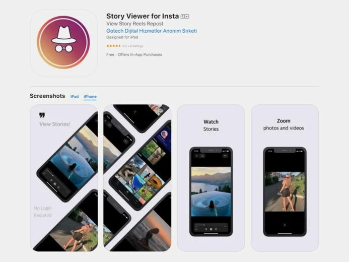 Story Viewer (iOS). Это приложение для айфона удобно тем, что не требует авторизации и предлагает бесплатные опции. Однако через него можно просмотреть только одну сториз – за остальные потребуется платить. Преимущество приложения в том, что через него можно просматривать в том числе закрытый аккаунт. Однако в этом случае потребуется авторизоваться.