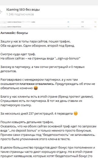 Другая проблема — это халявщики и бонусхантеры. Про вред профессиональных абузеров бонусов казино и БК мы рассказывали в отдельном материале. А про халявщиков, которые хотели получить бездепозитный бонус, рассказали сеошники в одном из тг-каналов.