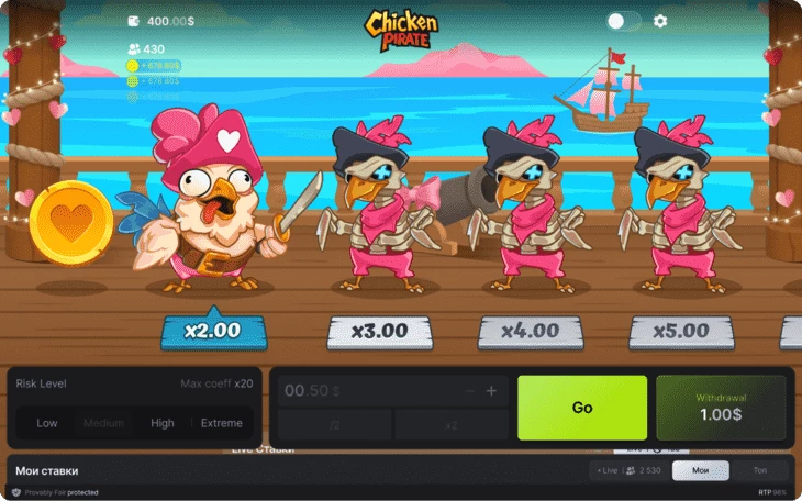 Chicken Pirate | 100HP Gaming | 2025 | 97% | Low / medium / high / extreme | Ко Дню всех влюбленных Chicken Pirate вышел в романтичном рескине, но это все та же instant-игра, где каждое решение похоже на признание: смелое, мгновенное и способное привести прямо к сокровищам |