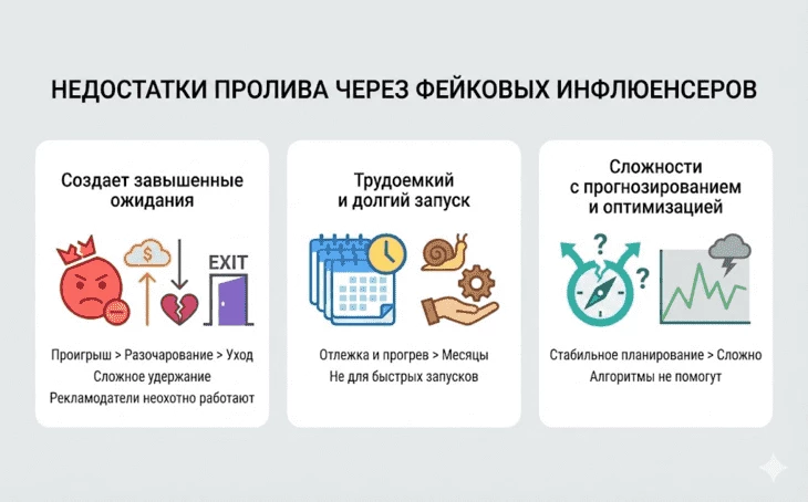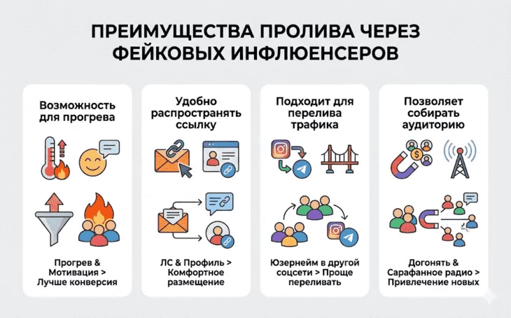 Начнем с преимуществ пролива через фейковых инфлюенсеров: