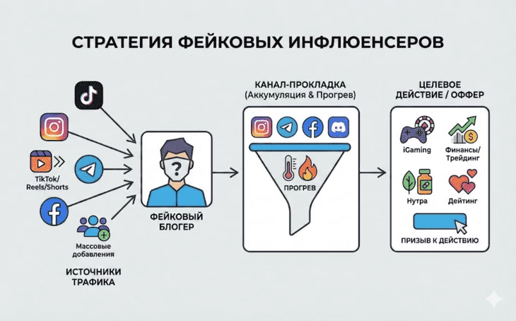 Стратегия фейковых инфлюенсеров — это подход, при котором арбитражник создает и ведет публичный канал от имени выдуманного блогера. На этот канал переливают трафик, в нем аккумулируют и прогревают аудиторию, после чего ее призывают совершить целевое действие. Чаще всего используется в iGaming, финансах и трейдинге, но также применим к нутре, дейтингу, свипстейкам.