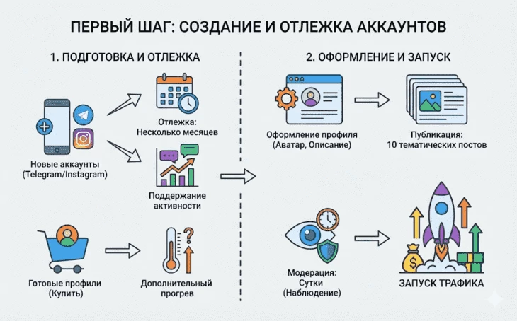 Первый шаг — вам необходимо создать аккаунты и каналы, чтобы дать им отлежаться. Под долгосрочное ведение арбитражники советуют использовать аккаунты Telegram или Instagram с отлежкой в несколько месяцев, поэтому стоит подготовить профили и поддерживать на них активность заранее. Альтернативный вариант — купить уже готовый профиль, но найти действительно качественные аккаунты будет сложно, им может потребоваться дополнительный прогрев.