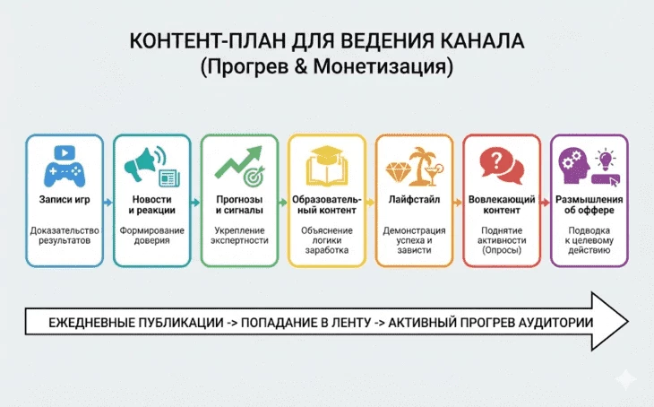 Все, что остается далее, — вести канал, аккумулировать аудиторию и постепенно ее монетизировать. Чтобы прогревать пользователей, важно каждый день публиковать контент и попадать в ленты подписчиков. Для этого потребуется контент-план — вот что можно в него включить: