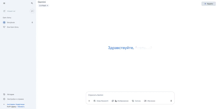 Если вы планируете работать на бесплатном тарифе и Flash-модели, то обход ограничений займёт минимум времени. Достаточно подменить IP устройства на европейский и нейросеть станет доступна, даже если страна аккаунта Google — Россия.