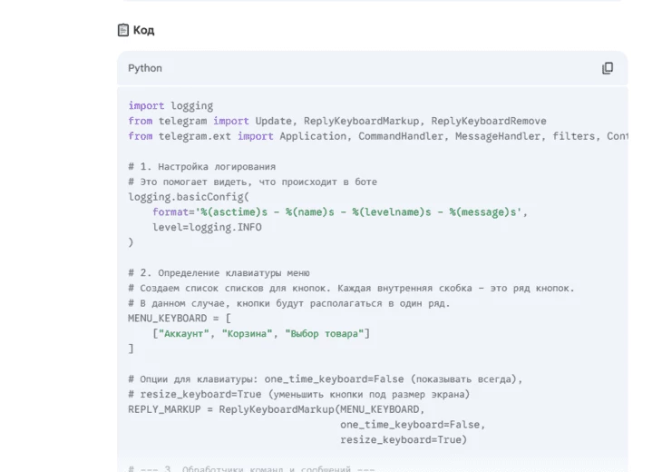 Для примера мы попросим нейросеть создать фрагмент кода для чат-бота с помощью запроса: