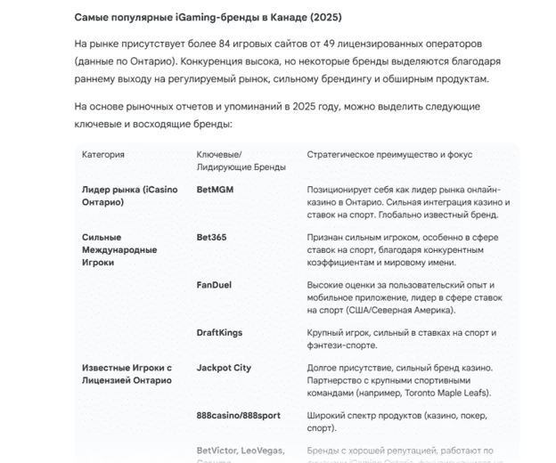 Также нейросеть собрала данные о популярных iGaming-брендах Канады в 2025 году.