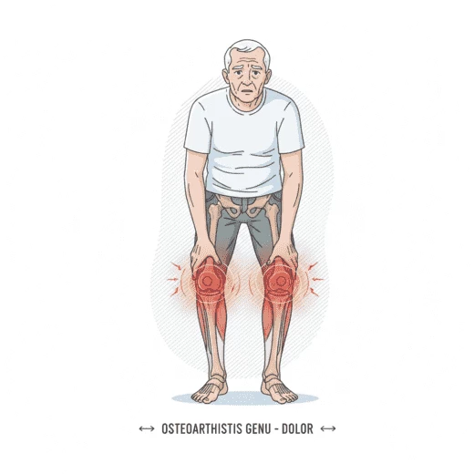 Нарисуй пожилого белого европейца, у которого болят колени. Наглядно отрисуй источник боли красным цветом, сделай это в стиле медицинской иллюстрации.