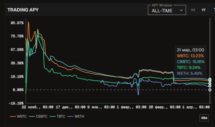 Заработать очень много не получится — сайт протокола говорит о том, что текущая годовая доходность от комиссий составляет 9–15% на BTC в зависимости от выбранного пула и 5,5% на WETH.
