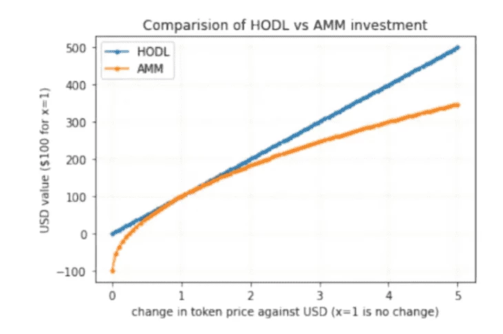 Есть интересный график сравнения двух стратегий: прямая HODL отвечает за стратегию пассивного удержания, а кривая AMM — за стратегию с вложением в пул ликвидности.