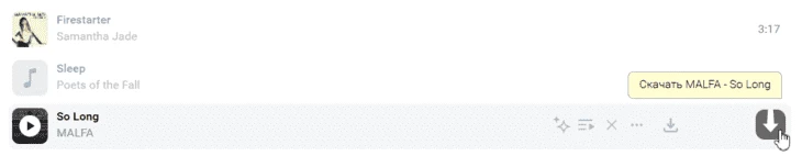VK Music Downloader (Chrome) — после установки плагина кнопка в виде синей стрелочки загорается рядом с песней, и она мгновенно сохраняется в MP3.
