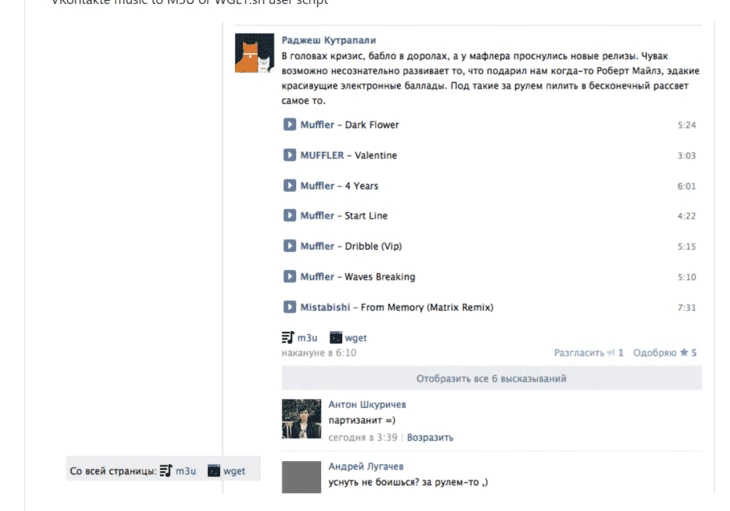 vk-m3u-greasemonkey. Генерирует плейлист в формате .m3u содержащий команды wget, чтобы загружать треки пакетно. Полезно тем, кто знаком с командной строкой.