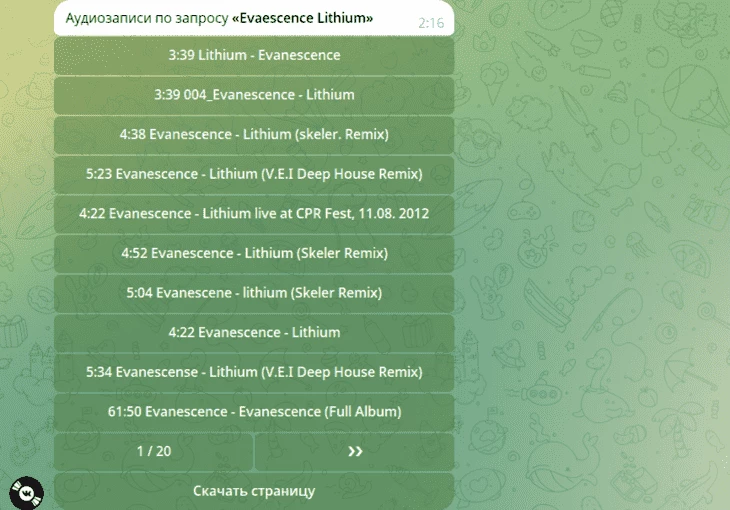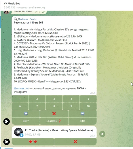 Еще один популярный способ — использовать Телеграм-ботов. Достаточно отправить боту ссылку на трек или ввести название песни, и он выдаст файл для сохранения. Это удобно, быстро и прямо в мессенджере. Но у ботов есть минус — они не всегда стабильны: сегодня грузят, завтра могут быть заблокированы.