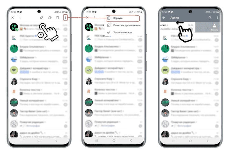 Нюанс: В некоторых версиях Android короткий свайп закрепляет архив над переписками, а длинный (или повторный) — прячет.