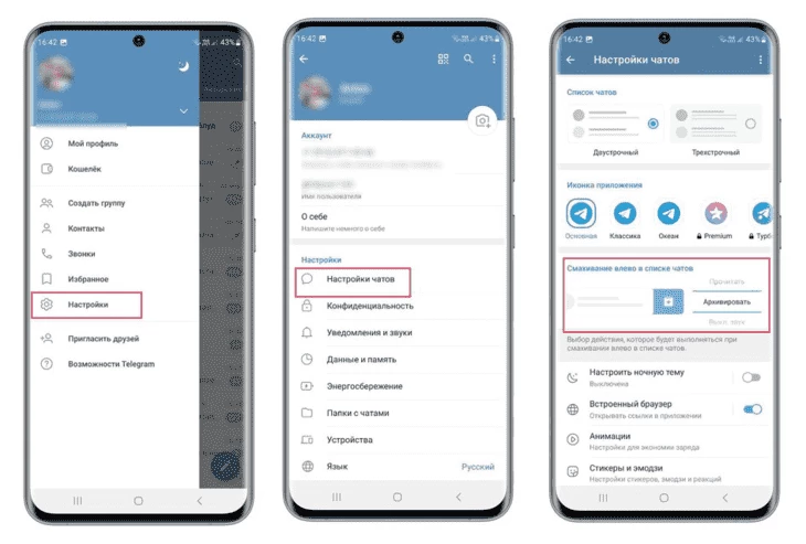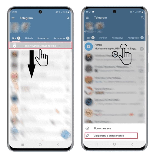 Этот метод демонстрирует, как скрыть архив в Телеграмме на телефоне с ОС Android. Нужно несколько действий: