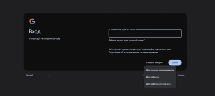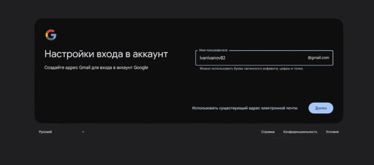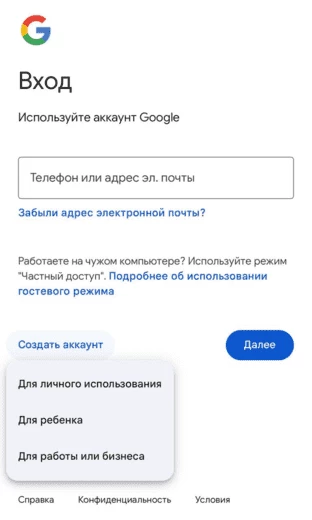 Зайдите в Google и кликните на «Создать аккаунт». Укажите тип учетной записи: личный или для компании. Затем укажите свое имя и выбирайте «Далее».