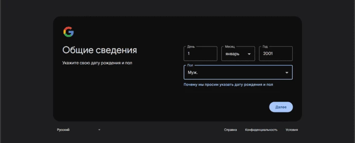 Чтобы зарегистрироваться в Google, вам должно быть не меньше 13 лет, учитывайте это при вводе даты рождения. Это требование действует в России. Для пользователей из других стран могут быть свои правила и настройки. Если юзеру еще нет 13 лет, то зарегистрироваться получится только с помощью почты и SIM одного из ваших родителей.