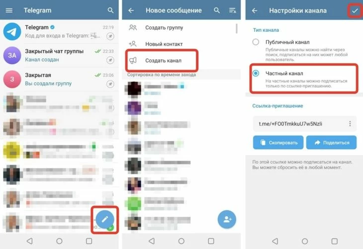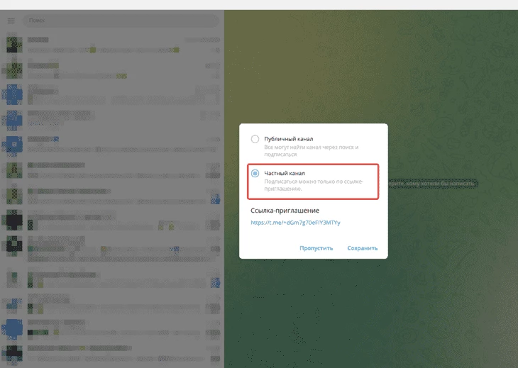 На следующем этапе укажите тип группы «Частный канал». Программа автоматически сгенерирует ссылку, которую затем вы будете рассылать как приглашение. Снова кликните «Сохранить», чтобы завершить процесс.