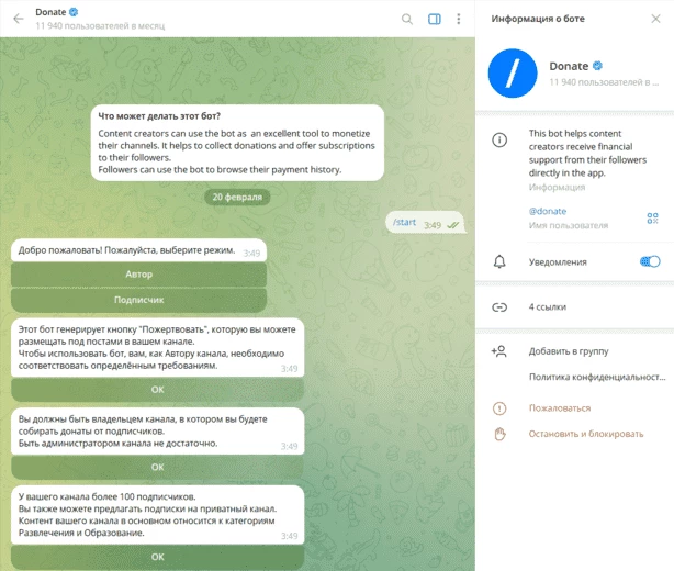 Если вы публикуете полезный или развлекательный контент, подписчики могут поддерживать вас донатами. Чтобы получать пожертвования, укажите реквизиты (карта, электронные кошельки, криптовалюта) или используйте сервисы оплаты по подписке, такие как Boosty. Внутренние переводы можно настроить через бот @donate – с его помощью можно встроить кнопку «Пожертвовать» под публикациями.
