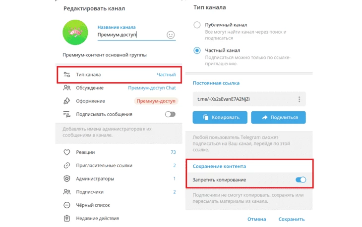 По умолчанию присоединившиеся к частным группам пользователи могут копировать, переносить и сохранять все публикации. Это может стать причиной плагиата или кражи контента. Чтобы запретить копирование публикаций, перейдите в настройки, откройте раздел «Тип канала» и включите соответствующую опцию.