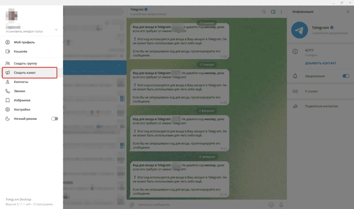 Запустите софт и кликните по значку меню в левом верхнем углу. Появится окошко настроек аккаунта, где нужно выбрать вариант «Создать канал».