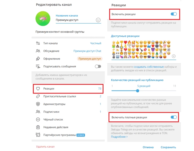 Если опция отключена, подключите ее при помощи тумблера «Включить реакции». Вы можете выбрать доступные смайлики и ограничить количество эмоций. Можно включить функцию «Включить платные реакции». В этом случае премиум-пользователи будут отправлять звезды, которые вы сможете обменять на криптовалюту TON.