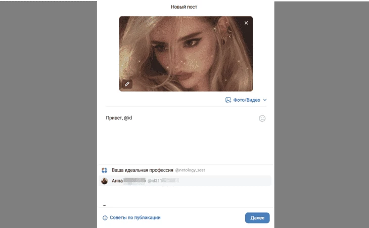 - Создайте новый пост и напечатайте символ @ либо звездочку.