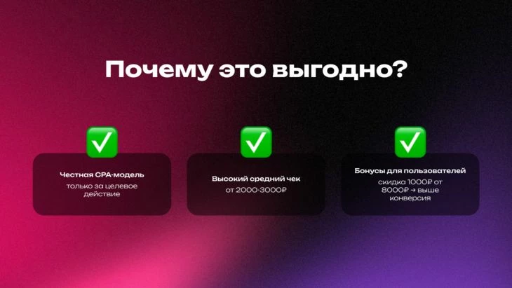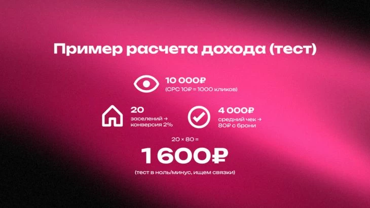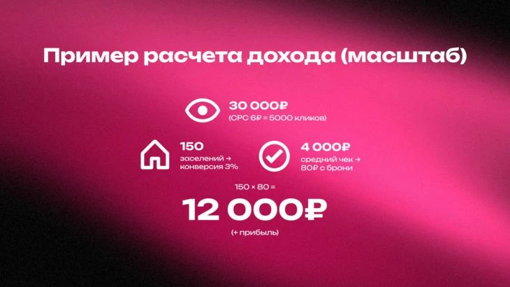 ✅Целевое действие честное. Платят не за клик и не за регистрацию, а за реальное бронирование с заселением. Это отсекает ботов и рандомный трафик.