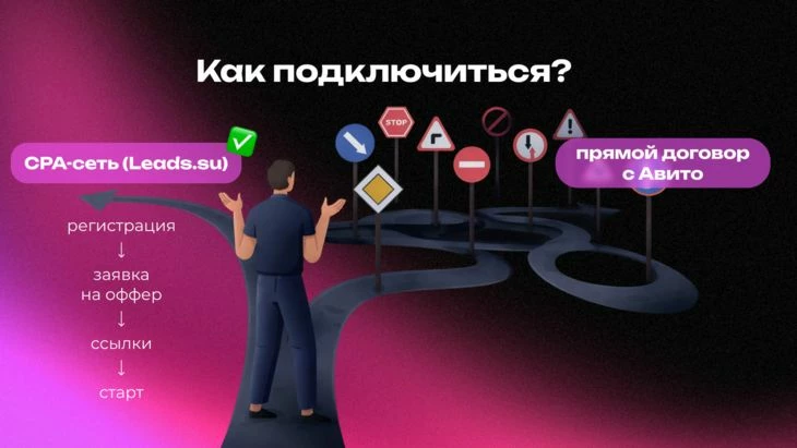 Прямой путь. Вы идете на сайт Авито, в раздел для партнеров, изучаете условия, оставляете заявку. Для программы «Авито Путешествия» это реально, но придется разбираться самому, подписывать договоры, ждать ответа менеджеров. Для крупных агентств это ок, для вебмастера, который хочет быстро протестировать оффер, — слишком долго.